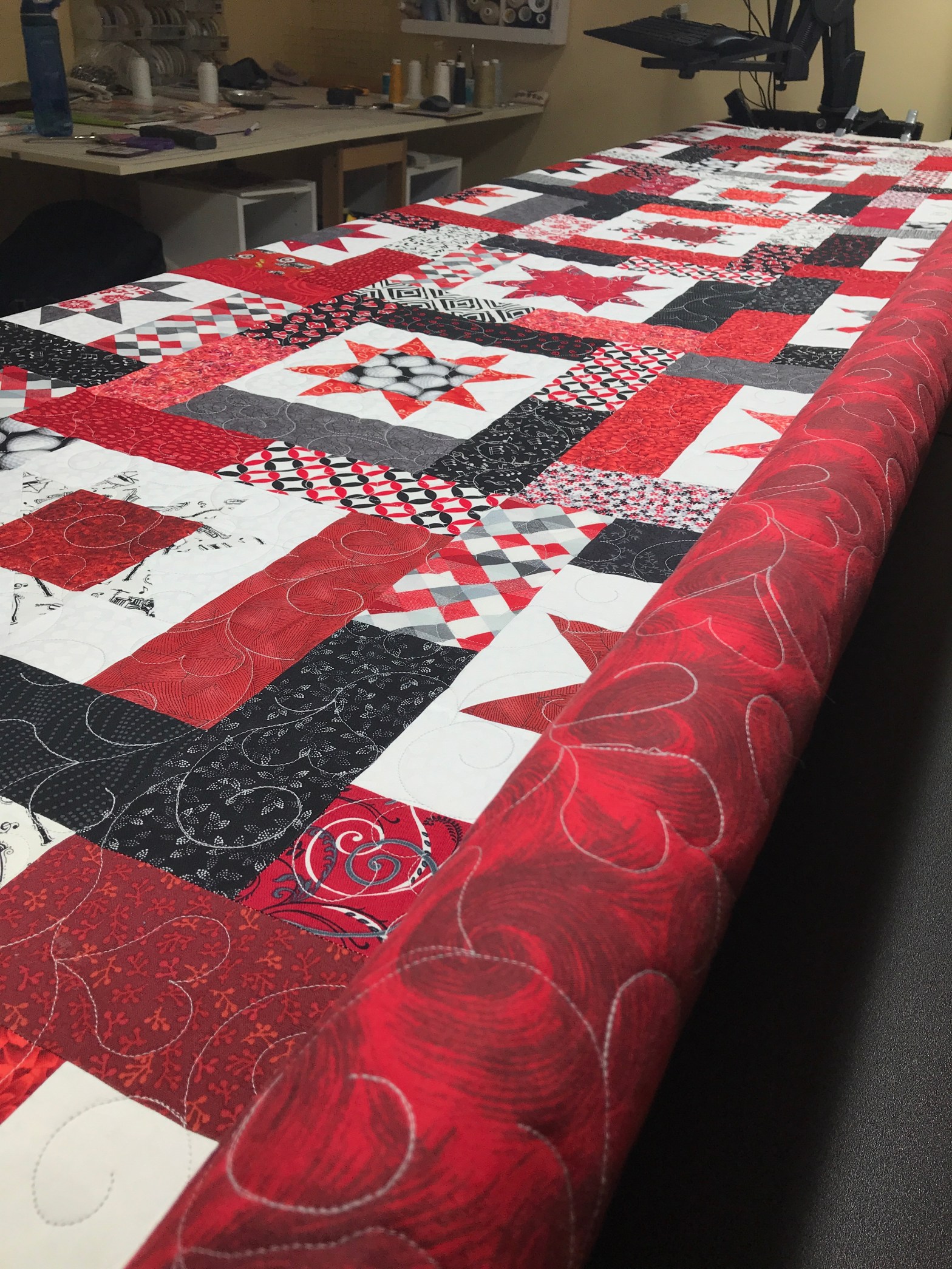 Highly, highly recommend The Finishing Touch! I had a monster of a quilt (120×120) and she did a BEAUTIFUL job on it. Communication was great throughout the whole process. I had many, many choices of designs to choose from. Very friendly and I felt as if she were truly invested in my quilt and treated it as her own. Will be a repeat customer!